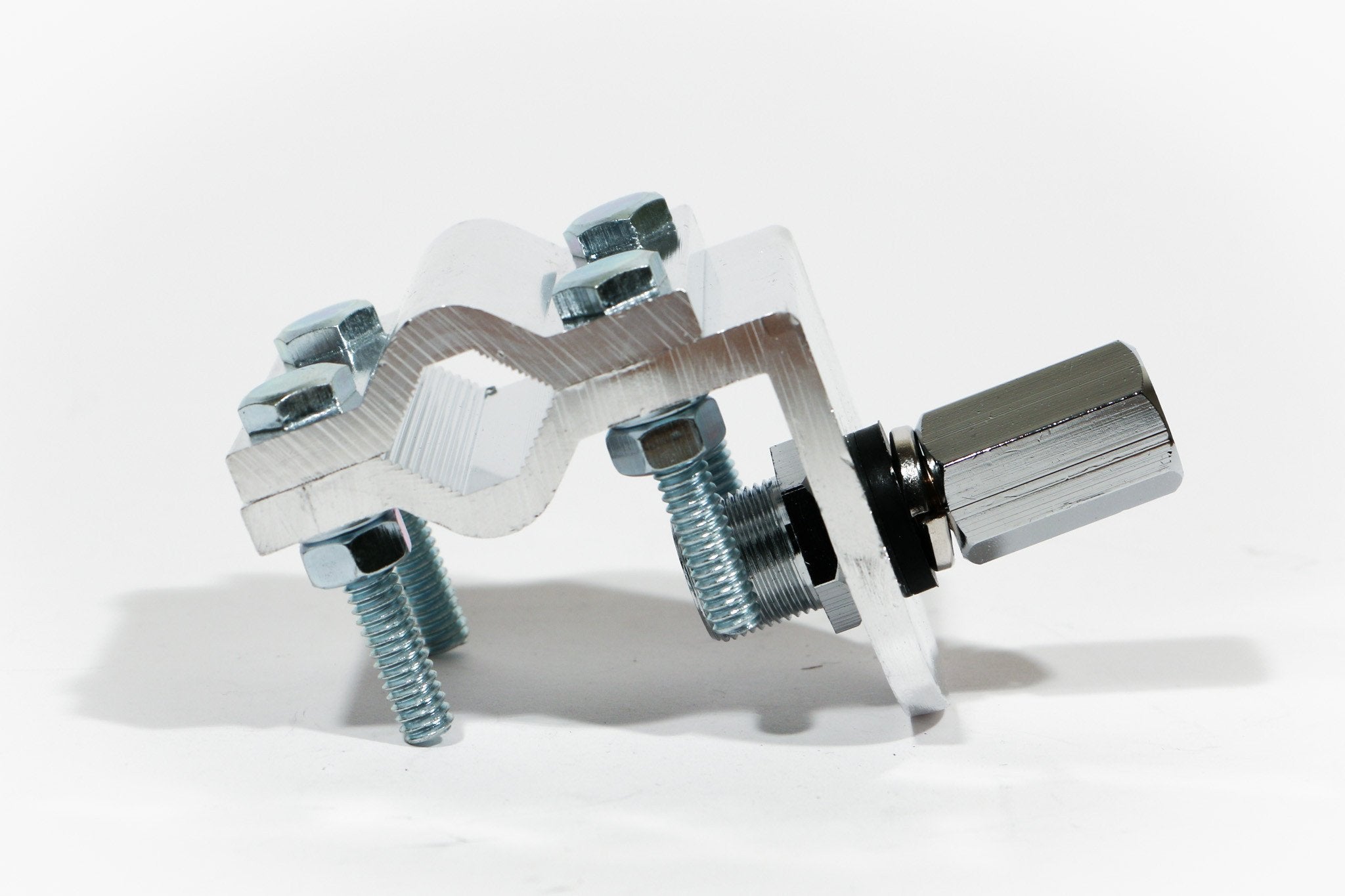 The mount features dual mirror grooves, a four-bolt assembly and a heavy duty PL-259 antenna stud for superior antenna support. It's made to support a large antenna that can be attached to a thick mirror arm or horizontal bar.