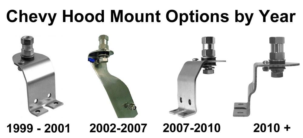 Mounting Hardware: Included in the kit is a Chevy hood mount. The mount attaches to an existing bolt on the hood rail and has additional bolt holes if you want to add stability. Please see the links below for more mounting details.