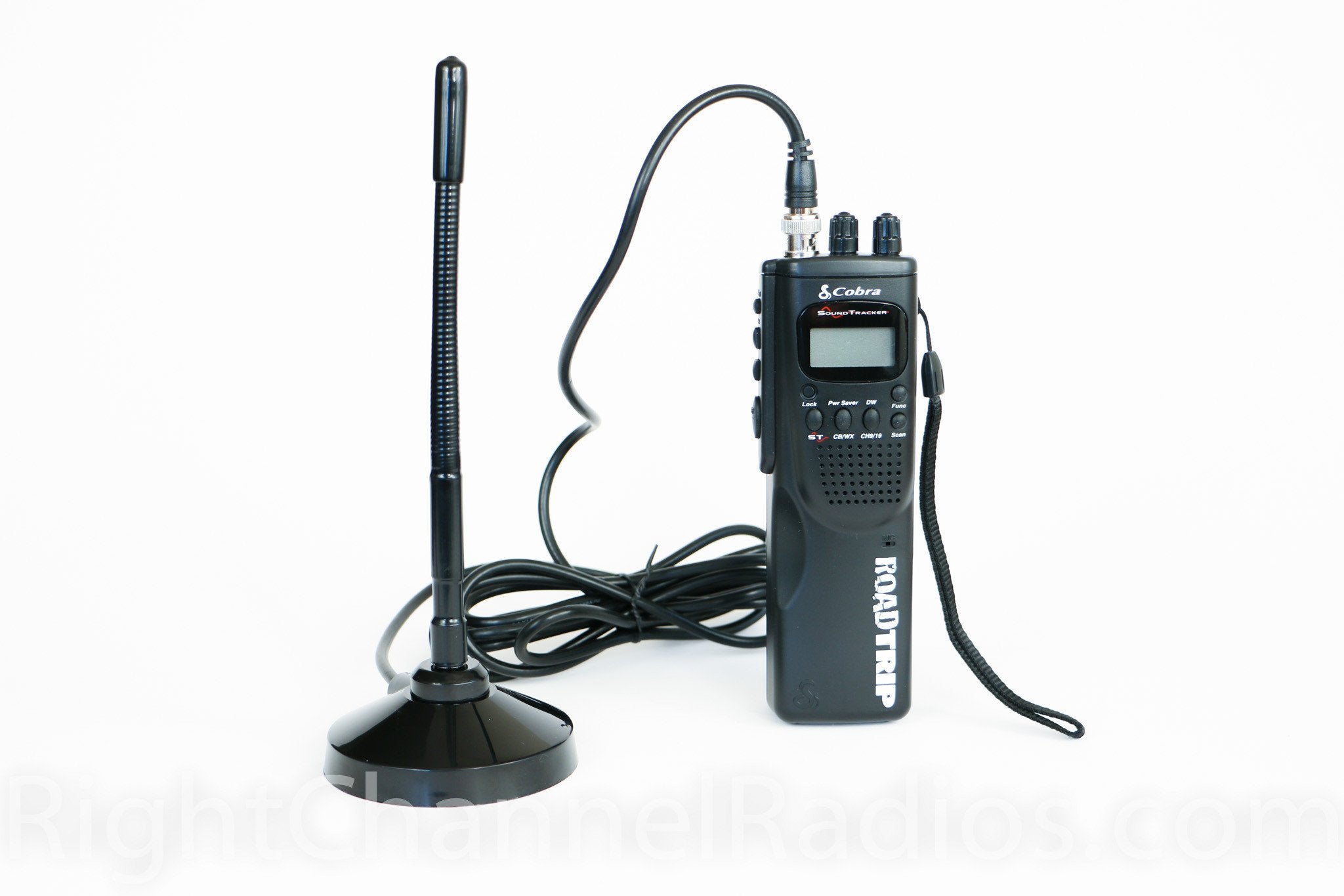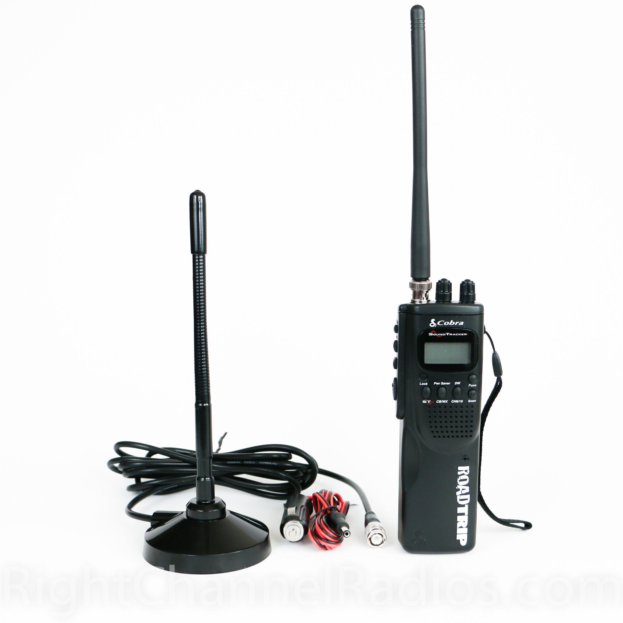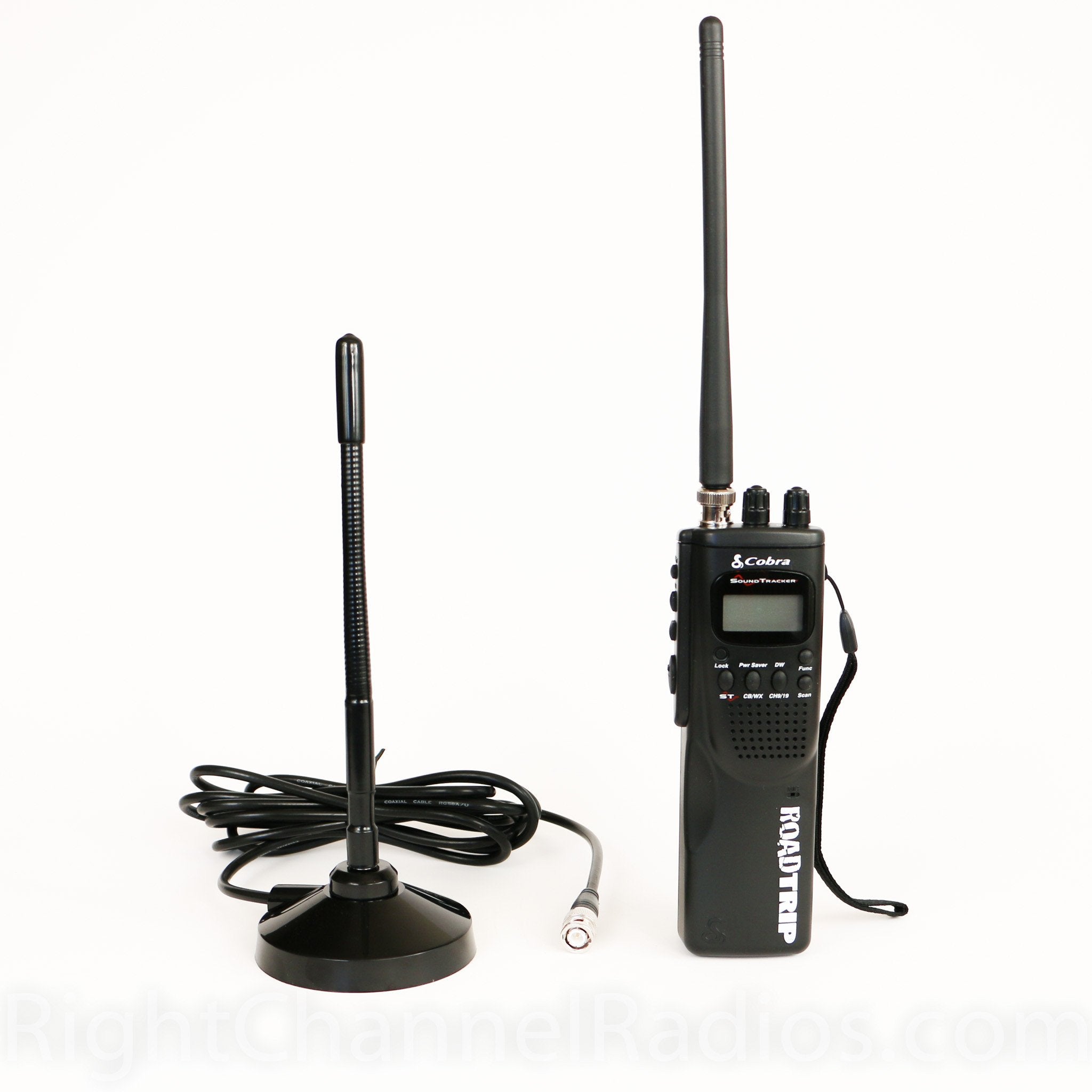 The Cobra HH Road Trip is the ultimate handheld CB package! It offers all the features of the Cobra HH 38 WX ST, with the addition of a mobile magnet CB antenna. Use this radio as a handheld with the rubber duck style antenna or attach the mobile magnet mount for use in the vehicle. Stay ahead of the weather with 10 built-in NOAA weather channels and monitor two CB channels at once with the dual watch function. Send and receive clear CB signals using Cobra's patented SoundTracker technology. The Cobra HH Road Trip is powered by nine AA batteries or the included DC cigarette power adapter. Perfect for short-range CB users who want to use their handheld radio in a vehicle!