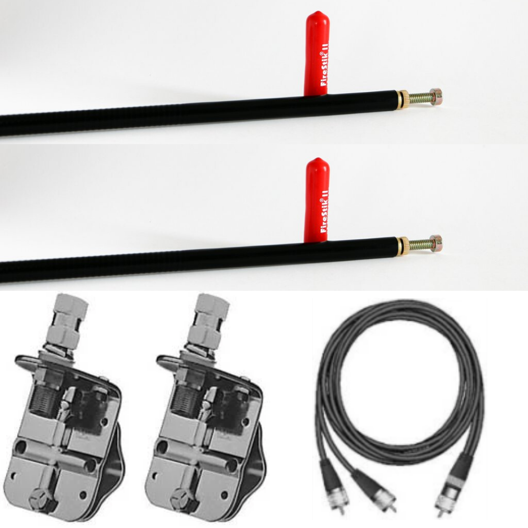 This CB antenna kit from Firestik is the ideal solution for those needing a high-quality, complete dual antenna kit for their truck, car, van, Jeep or RV. Firestik antennas and mounting equipment are highly respected, and the components in this kit are well built and made from premium materials -- and all components are guaranteed to work together seamlessly! This kit includes two Firestik FS series tunable CB antennas, 18' of co-phased coax cable, and two mirror mounts. Buying this kit saves you more than 30% compared to buying the components individually.