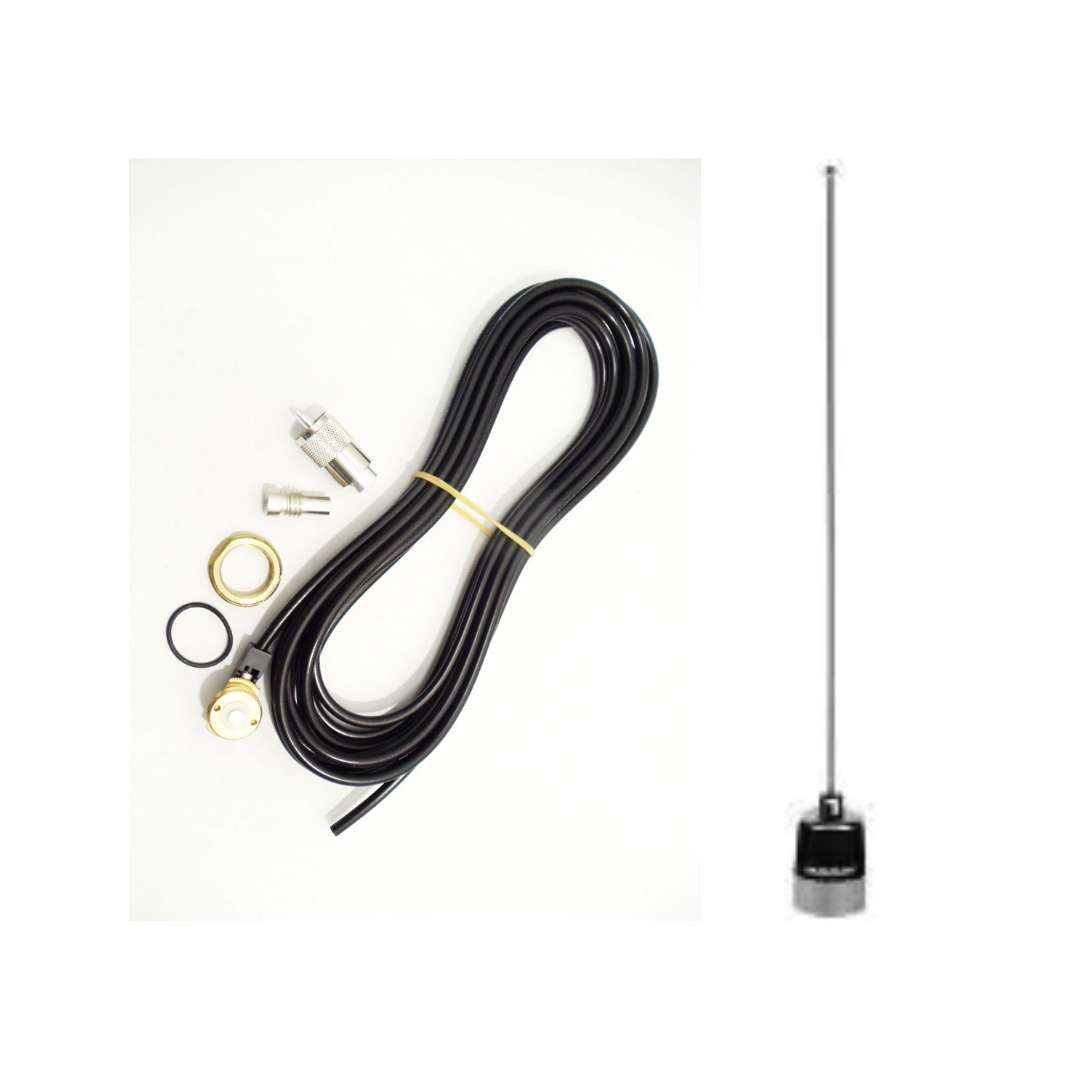 Reach new heights with this Maxrad Roof Antenna Mount, made specifically for NMO mobile antennas (GMRS). It fits a .75" hole and comes with a 17-foot RG58A/U Coax Cable & Amphenol Solder on PL-259 UHF/M Connector. and done! The accompanying stainless steel antenna, a Maxrad 450-470MHZ 3DB UHF Antenna, is built for any beating you might give it.